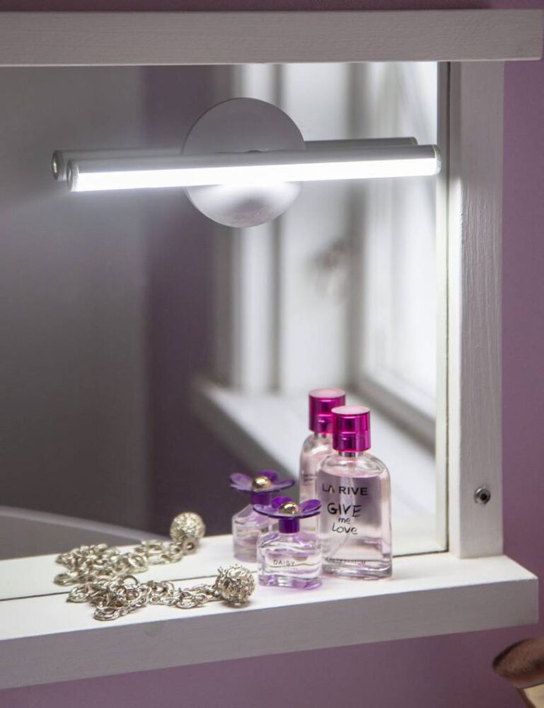 Monikäyttöinen LED-valaisin, joka sopii niin meikkaamiseen, työ- tai yövaloksi sisätiloihin. Valoa voi käyttää pysty- tai vaaka-asennossa ja sen voi kiinnittää seinään tai pakkauksessa olevalla imukupilla esim. peiliin.