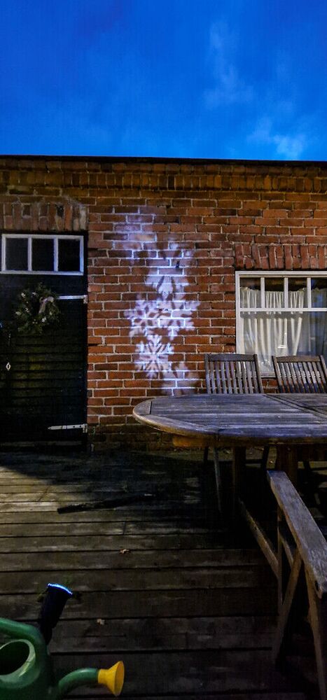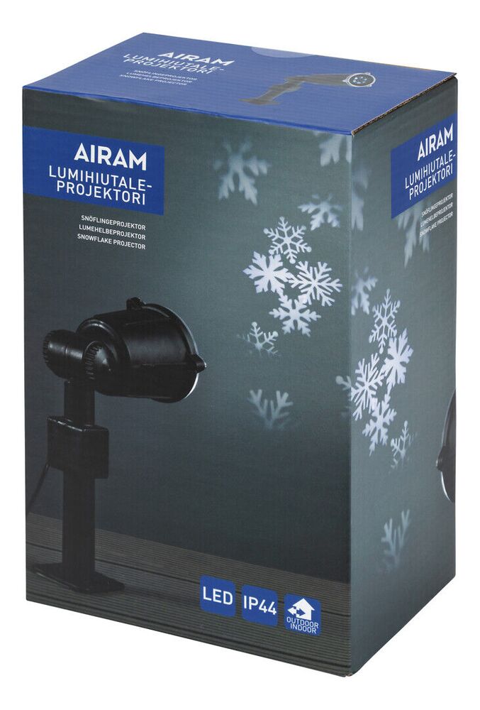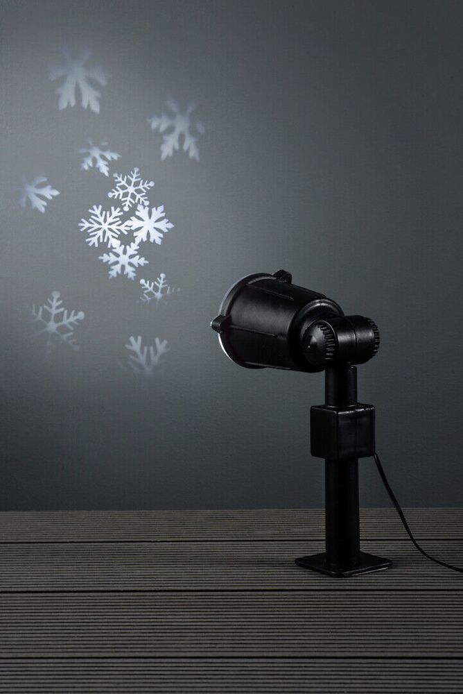 Sisälle tai katettuun ulkotilaan soveltuva projektori, joka heijastaa upeita lumihiutaleita ja tähtikuvioita pyörivällä liikkeellä. Heijastus n. 10 m² 3-5 m etäisyydeltä. Kääntyvä valo, joka voidaan lukita tiettyyn asentoon.