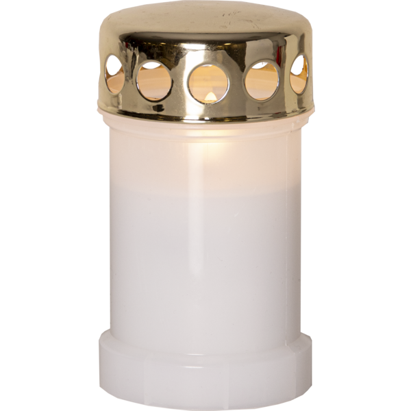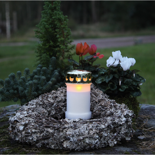 Kaunis valkoinen hautakynttilä lämpimän valkoisella LED-liekillä. Kynttilä toimii kahdella C-paristolla, jotka eivät sisälly pakkaukseen. Pitkä paristokesto, noin 2500 tuntia. Kiinteä LED, lamppua ei voi vaihtaa.