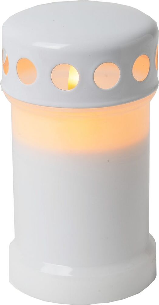 Kaunis valkoinen hautakynttilä lämpimän valkoisella LED-liekillä. Kynttilä toimii kahdella C-paristolla, jotka eivät sisälly pakkaukseen. Pitkä paristokesto, noin 2500 tuntia. Kiinteä LED, lamppua ei voi vaihtaa. Väri valkoinen