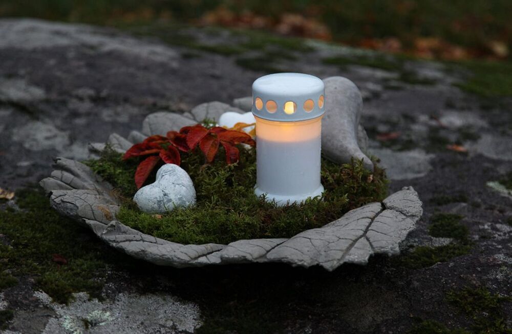 Kaunis valkoinen hautakynttilä lämpimän valkoisella LED-liekillä.