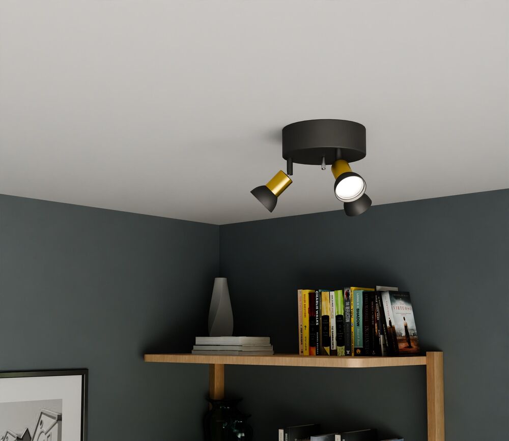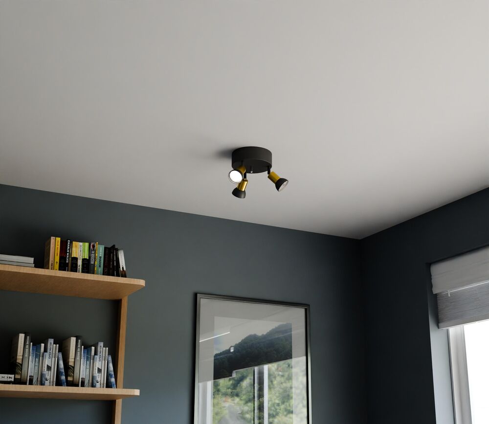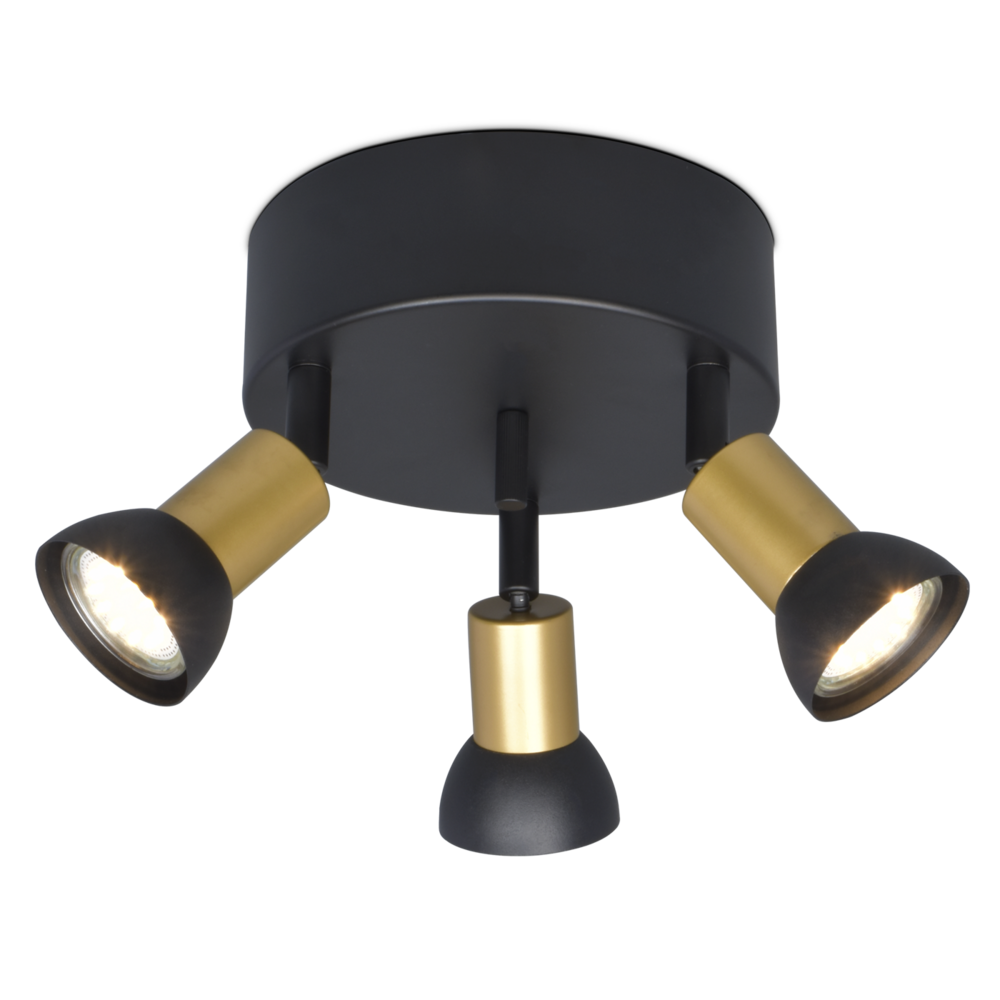 Havanna-spottivalaisin kolmella kohdevalolla on käytännöllinen valinta esimerkiksi eteiseen, keittiöön tai vaatehuoneeseen. Mustan ja kullan kontrasti luo tilaan ylellisen ja modernin tunnelman ja pyöreä, huomaamaton kattokuppi antaa valaisimen leijua kevyesti katossa.