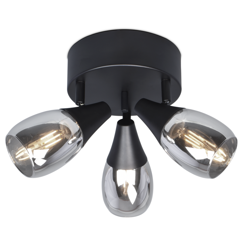 3-osainen Moon-kattospotti sisältää kolme suunnattavaa valonlähdettä, jotka luovat pehmeän yleisvalon esimerkiksi eteiseen, olohuoneeseen tai makuuhuoneeseen. Savunharmaat lasikuvut ja mattamusta runko yhdistettynä pyöristettyyn siluettiin luovat skandinaavisen, modernin ilmeen.