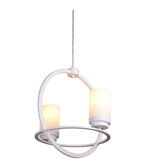 Materiaali: Metalli, lasi Väri: Valkoinen, valkoiset lasit Mitat: 45 x 43 cm, korkeus 45 cm. Kettinki + johto 1,2 metriä Valoteho: 2 x E27, max 60 W Asennus: Kattopistoke, pistotulppa sisältyy. Helppo asentaa