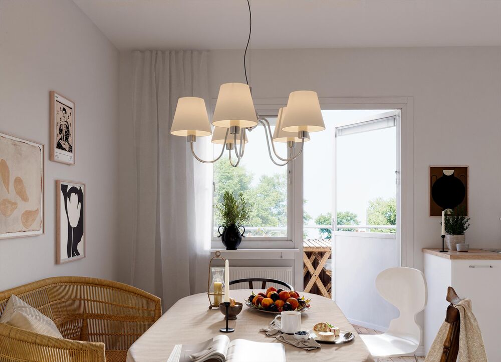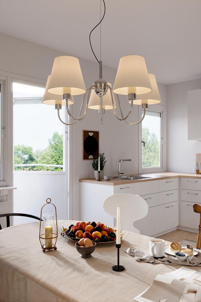 Lynx on näyttävä kattovalaisin, jossa useat tekstiilivarjostimet suodattavat valon pehmeäksi ja miellyttäväksi. Valaisimen ajaton muotoilu sopii monenlaiseen sisustukseen, ja sen suuri halkaisija tekee siitä näyttävän keskipisteen huoneeseen. Musta tekstiilijohto viimeistelee tyylikkään kokonaisuuden ja tuo valaisimeen selkeää ryhtiä. Lynx sopii erityisen hyvin ruokapöydän yläpuolelle tai olohuoneeseen, kun haluat tilaan lämpimän tunnelmallista ja tasaisesti jakautuvaa valoa.